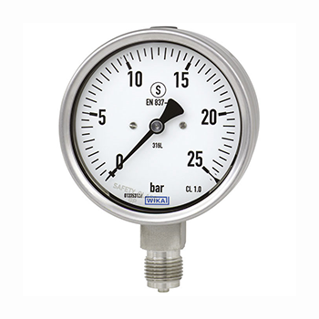 WIKA)根據(jù)EN 737-1歐洲標(biāo)準(zhǔn)“S3”安全版的要求制造并認(rèn)證壓力表。安全型壓力表由非破碎窗口、測量系統(tǒng)和表盤之間的安全隔爆層和安全泄壓后蓋組成。如果發(fā)生故障,操作員在前側(cè)受到保護(hù),介質(zhì)或組件只能通過外殼背面彈出。