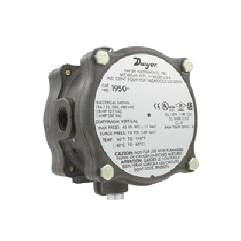 1950型防爆差壓開關(guān)綜合了1900系列差壓開關(guān)的所有性能,再配備防爆或全天候的防護(hù)外殼,使其應(yīng)用更加廣泛,應(yīng)用價(jià)值也更高。它有CE,UL和CSA,F(xiàn)M認(rèn)證,防爆級(jí)別為Class I, Div 1, Groups C and D, Class II Groups E, F, and G and Class III hazardous atmospheres NEMA 7 & 9. Raintight NEMA 3 (IP54)。全天候防護(hù)外殼上帶有排水堵頭和O型環(huán)密封,打開前蓋板就能很容易接線??稍诜雷o(hù)外殼的外面調(diào)整設(shè)定點(diǎn)。有12種型號(hào)供選擇,從0.03"到220"英寸水柱(7.5到5000PA)和從0.5到50psi(0.035到3.5Bar)。1950型防爆差壓開關(guān)體積小,重量輕,體積和重量相當(dāng)于其它防爆開關(guān)的一半。